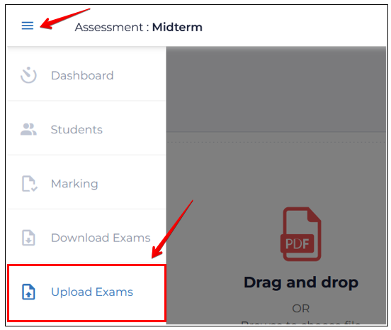 Scanning can be completed using standard office printer/scanners including continuous feed devices that output single PDF files. Scanning should occur at 200dpi resolution or higher and should be done on a darker setting. The resulting PDF file containing any number of individual student copies can be uploaded by opening the left nav menu via the icon at top left, then selecting Upload exams: