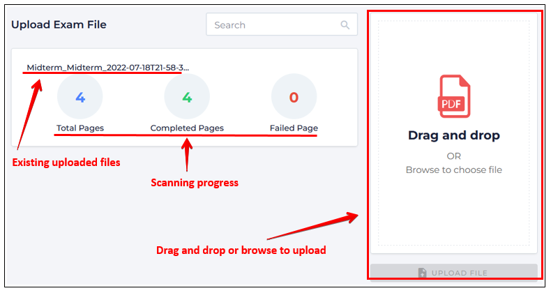 Next, upload the PDF version of your exam file by drag-dropping or browsing. This file should contain all the questions and space for students to complete their answers: