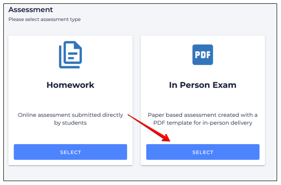 With that in hand, instructors should begin by adding an Assign2 tool to their course, ensuring that the ‘Grade’ points selected matches what the eventual points total will be for the assessment. Once the tool has been added, click the tool link in the course and select In Person Exam: