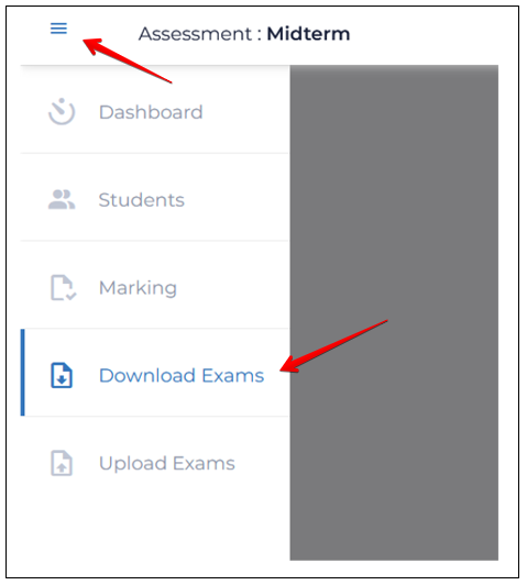 From the dashboard page, open the left nav menu using the icon at the top left, then select Download exams: