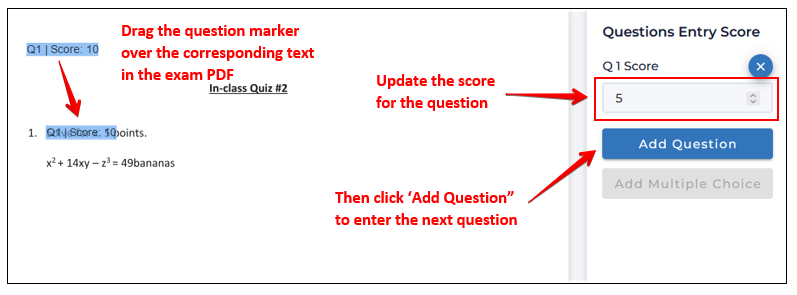 Scrolling down, instructors will then create the question placeholders to be linked to the Assign2 grading interface. To add a question, click Add Question then drag-and-drop the blue question marker over top of the question in the underlying template, then enter the point-value for the question to match the assessment item: