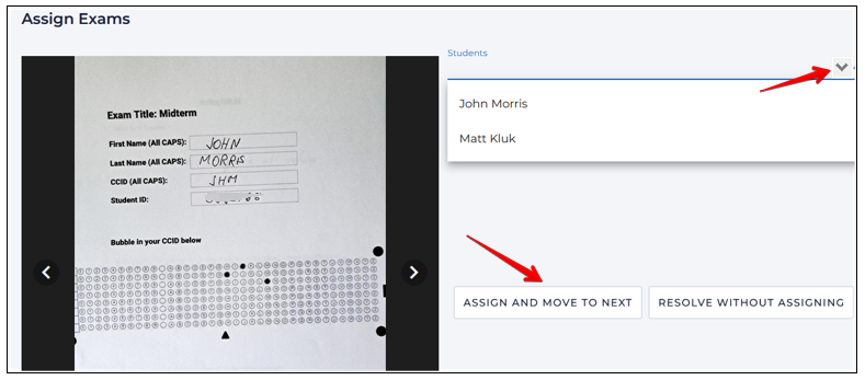To link unassigned exams to particular students, the completed exam is displayed in a preview window. If an exam author can be identified, select their name from the dropdown list and click Assign Exam: